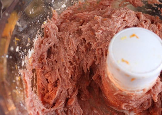Texture of raw beef dumpling filling mixed in the food processor with the dough blade.