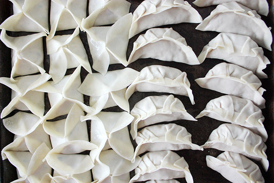 Now you can start wrapping the dumplings. One way is to pleat the edges (to get that gorgeous crescent effect), another is to press the edges firmly with your fingers (and get a simple semi-circle). The wonderful thing about wrapping with homemade, fresh dough is that there is no need to wet the edges with water. The wrappers are naturally adhesive.